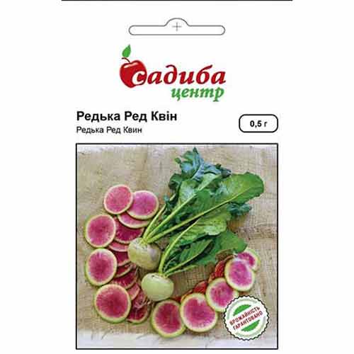 Редька Ред Квін - середньостиглий, урожайний сорт. Період дозрівання 50-60 днів від посіву насіння. Плоди округлої форми, вагою від 300 г, зовнішня шкірка біло-зеленого кольору. М'якоть від червоного до ніжно-рожевого кольору, дуже соковита і ніжна, з високим вмістом цукру. Особливий декоративний вигляд редька набуває в розрізі і ідеально підходить для приготування різноманітних салатів. Надзвичайно смачні плоди Ред Квін мають особливо презентабельний вигляд в салатах і інших стравах. Під час зберігання зберігає свою соковитість і характеристики до чотирьох місяців. Ви можете замовити насіння редьки в нашому інтернет-магазині без передоплати.