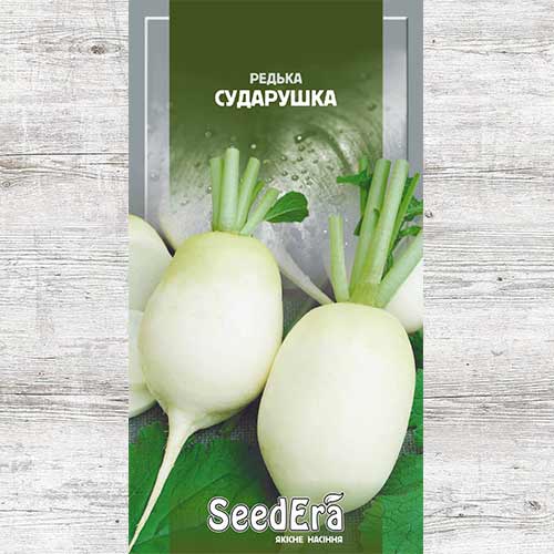 Редька Сударушка - ранньостиглий, високоврожайний сорт. Термін дозрівання від сходів 30 - 35 днів. Дуже добре підходить для весняного і осіннього періоду. Редька стійка до стрілкування. Коренеплід вагою до 56 г. М'якоть щільна, ніжна, соковита, має слабо гіркий смак. Культура холодостійка. У коренеплодах міститься величезна кількість клітковини, яка необхідна для нормального функціонування шлунково-кишкового тракту. Використовують в свіжому вигляді, соках і салатах.