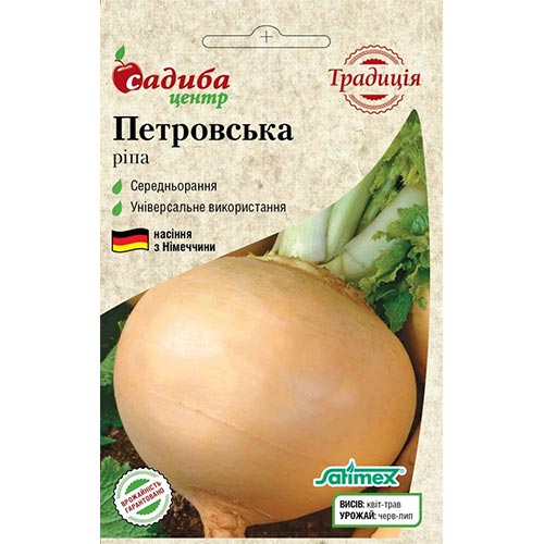 Ріпа Петровська – смачно та корисно! Середньоранній (70-80 днів) сорт. Коренеплоди округло-плоскі, золотисто-жовті, гладкі, масою 60-150 г. М'якуш у ріпи дуже соковитий, солодкий, багатий на вітаміни, білки, вуглеводи. Використовується як у свіжому вигляді, так і після теплової обробки. Сорт справді дуже смачний, рекомендуємо для овочевого рагу!