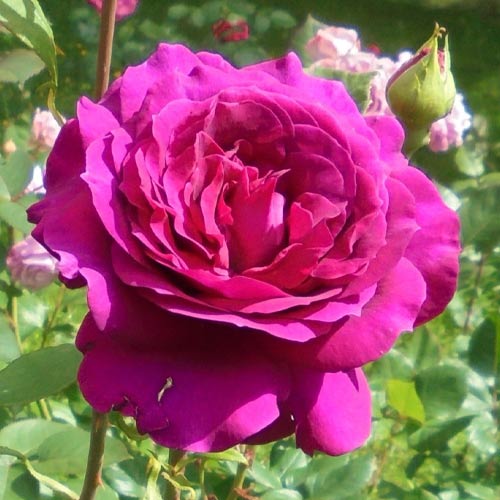 Троянда Біг Перпл (Big Purple) - чайно-гібридний, cильнорослі кущі Біг Перпл виростають прямими і досить компактними. Залежно від зовнішніх кліматичних умов можуть досягати висоти від 1,2 до 1,75 метра, обхват рослини - 100 сантиметрів. Зелено-бурі стебла вкриті темним зеленим листям вражаючих розмірів, а також рідкісними шипами. Квіти троянди Біг Перпл великі, чашоподібні, густомахрові. На кожному стеблі виростає тільки один квітковий екземпляр, що містить до 45 ніжних пелюсток. Троянда має цікаве і своєрідне забарвлення. У теплу погоду без опадів квіти переливаються відтінками малини і темного пурпуру. В'янучи, вони стають практично фіолетовими. Широко використовують у ландшафтному дизайні, прикрашаючи вхід в альтанку або терасу. Також підходять для зрізання.