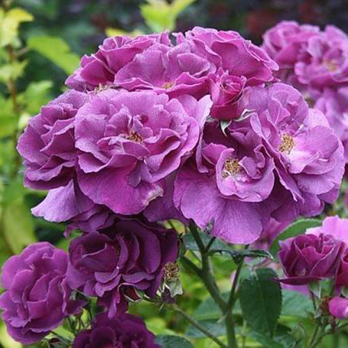 Троянда паркова Рапсодія ін Блю - відноситься до паркових з темно-фіолетовим забарвленням рясно квітучим сортам. Висота 120 - 150 см, ширина до 100 см. Квітки махрові, витончені з фіолетово пурпуровими щільними 25 пелюстками, з білим в середині і жовтими тичинками, при повному відкритті бутона відкритий центр, середнього розміру (5 - 6 см), частіше в суцвіттях, під час цвітіння змінює відтінок до сіро-блакитного. Цвітіння рясне, починається в червні. Складається з двох тривалих хвиль з перервою приблизно на місяць. Троянди дуже ароматні, з легким запахом гвоздики і прянощів. На сьогоднішній день ця троянда вважається однією з найбільш синіх. Стійка до захворювань. Ви можете замовити в нашому інтернет-магазині саджанці троянд без передоплати.