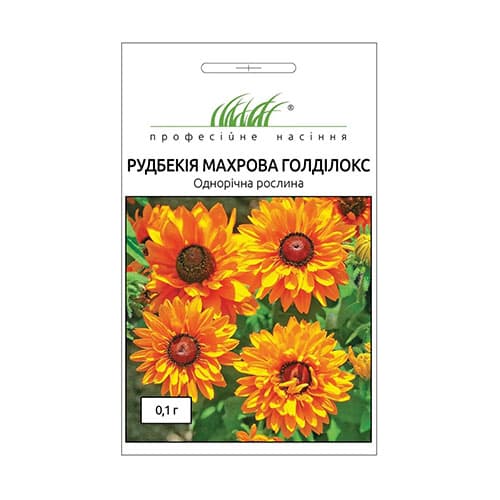 Рубекія Голділокс - Сорт рудбекії гібридної. Однорічна компактна трав'яниста рослина, що формує кущ 60-70 см висоти і до 45 см ширини. Кошики 6-10 см діаметром, махрові або частіше густомахрові, одиночні, верхівкові. Язички еліптичні, загострені, зубчасті, яскраві, насичено-золотисто-жовті. Дискові квітки чорно-коричневі формують дрібний яйцевидно-конічний диск. Цвітіння дуже тривале.