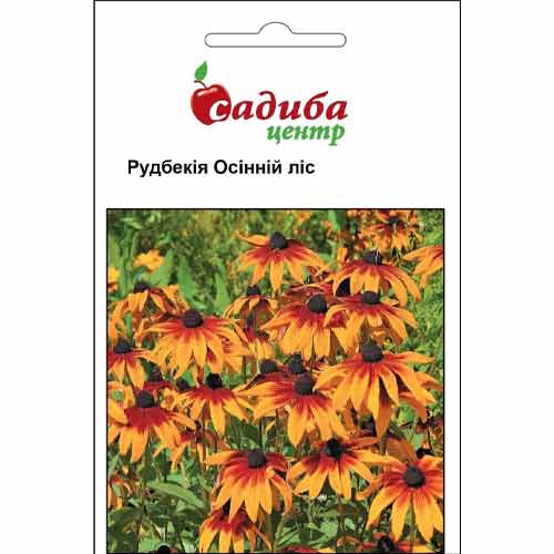 Рудбекія Осінній ліс – багаторічник із опушеним стеблом та бутонами діаметром 6-10 см. Помаранчево-жовтий тон края пелюсток ближче до центру переходить у насичено-червоний. Серединка опукла, коричнева. Висота рослини 60 см, її висаджують на клумбах та у рабатках.