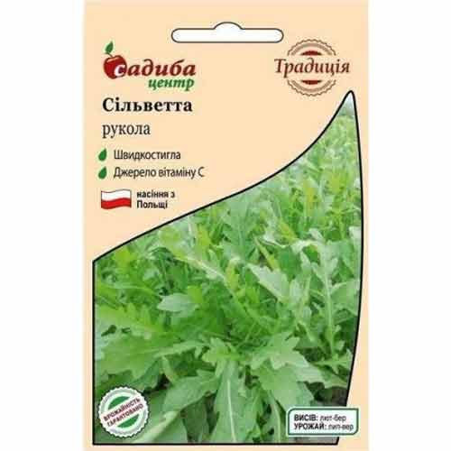 Рукола Сільветта - скоростиглий вузьколистий сорт руколи. Термін дозрівання 20-30 днів. Листя довге, сильно розсічене, зеленого кольору, має легкий гострий смак. Вирощувати руколу можна в теплицях, плівкових укриттях, відкритому ґрунті. Оптимальна температура для росту і розвитку рослин 16-18 ˚С. Ділянка для посіву має бути не на яскравому сонячному світлі, але й не в тіні. За регулярного поливу листя тривалий час залишається ніжним і не гірчить. Зелень використовують для салатів, бутербродів, до м'ясних і рибних страв. Листя руколи багате на вітамін С.