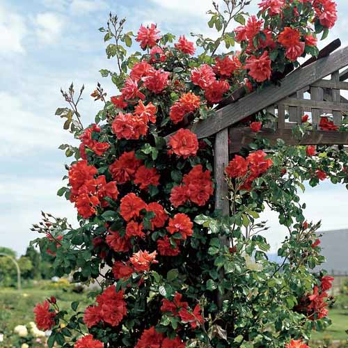 Троянда Червона (Red) - плетистий сорт, вибір більшості садівників, які люблять великі бутони яскравих насичених тонів. Троянда, висота стебел якої досягає 250-300 см. Численні пагони вкриті глянцевим листям темно-зеленого кольору і усипані пурпурно-мерехтливими великими квітками. Вони великі, напівмахрові, до 10 см у поперечнику, чашоподібної форми. Троянда стане справжньою окрасою будь-якої арки, альтанки, перголи, колони, огорожі, навісу.