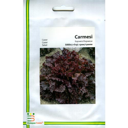Салат листовий Кармезі - темно-червоний салат зі швидким розвитком для відкритого та захищеного ґрунту, у тому числі і для гідропоніки. Для реалізації цілими рослинами або окремим листям, а також для нарізки та додавання в салатні суміші. Відносно висока швидкість росту. Велика розетка відкритого типу.