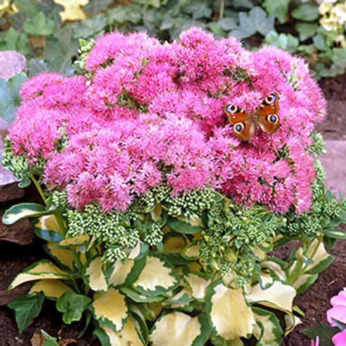 Седум (Очиток) MEDIOVARIEGATUM - ошатний багаторічник з оригінальним листям строкатого забарвлення. Червонуваті повзучі стебла прикрашені дрібним щільним листям сіро-зеленого відтінку з кремовою плямою в центрі і червоно-рожевою окантовкою краю листової пластинки. Дуже оригінальний вигляд має килимок седума без квітів, але в серпні відкриваються дрібні бутони і рожеві квіти додають ефектної краси рослині. Цвітіння триває жовтня. Рослина віддає перевагу сонячним ділянкам, використовується для декорування альпінарію, рокарію, переднього плану рабаток і клумб. Висота куща - близько 15 см.