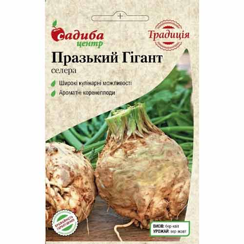 Селера коренева Празький гігант – сорт, який за термінами дозрівання належить до середньостиглих. Врожай буде готовий за 120-130 днів. Напіврозлогі кущики формують округлі плоди масою 250-500 г. З одного квадратного метра можна зібрати від 2,6 до 4 кг врожаю. Біла, соковита й ароматна м'якоть доречна в перших стравах, соусах і салатах. Господині її сушать та консервують.