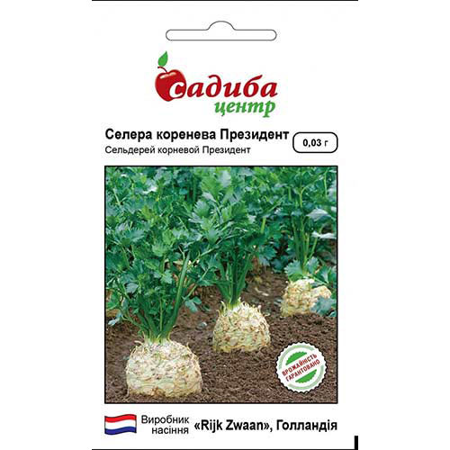 Селера коренева Президент - коренеплод середнього терміну дозрівання, який має приємні смакові якості і велику продуктивність. Висота дорослої рослини може досягати 45 см. Період дозрівання коренеплодів становить 110 - 120 днів з моменту висадки розсади. Коренеплоди великі 8 - 14 см в діаметрі, круглої форми з гладкою поверхнею. М'якоть білого кольору, без прожилок. Сорт стійкий до стрілкування. Зростає на родючому, дренованому і зволоженому ґрунті. Стійкий до хвороб. Рекомендується для постачання на ринок у вигляді свіжої продукції та зберігання. Ви можете замовити в нашому інтернет-магазині насіння селери без передоплати.