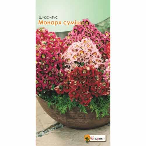 Шизантус Монарх – оригінальний сорт однорічних квітів, які не дуже поширені у садівників. Висота рослини може досягати до 80 см. Оригінальне різьблене листя шизантусу і саме відмінно виглядає на клумбах. Однак коли з'являються численні яскраві квіти з строкатим візерунком на пелюстках, погляд від рослин відвести неможливо. Цвітіння сорту триває з початку літа до осені.