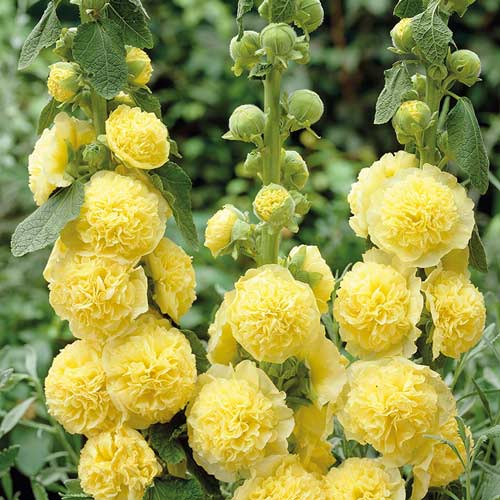 Шток-троянда махрова Єллоу – розкішний сорт висотою 0,8-1 м. Пагони прямостоячі, у верхній частині прикрашені бутонами лимонно-жовтого відтінку. Пелюстки множинні, злегка гофровані, що робить їх іще пишнішими. Діаметр однієї квітки при хорошому догляді сягає 15 см. Цвітіння тривале, з липня по вересень. Культура служить прекрасним медоносом. Якщо вам потрібно декорувати непривабливі стіни споруд, прикрасити паркан або візуально зонувати простір, то варто замовити саджанці штока-троянди Єллоу! Рослина добре поєднується з рудбекіями, флоксами, соняшниками та космеями.