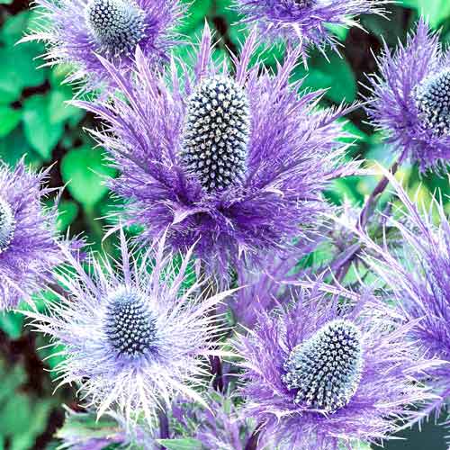 Синьоголовник Блю Стар (Eryngium Alp. Blue Star) – дуже ефектний та незвичайний багаторічник. Під час цвітіння, у липні – серпні, на ньому формуються суцвіття-конуси, які підкреслені великою кількістю вузького колючого листя. Воно зафарбоване у складний синьо-бузково-стальний відтінок і виглядає, немов пір'я дивовижного птаха. Висота дорослої рослини досягає метра, а його ширина – 60 см. Використовується у одиночних або групових посадках та у зимових флористичних композиціях.