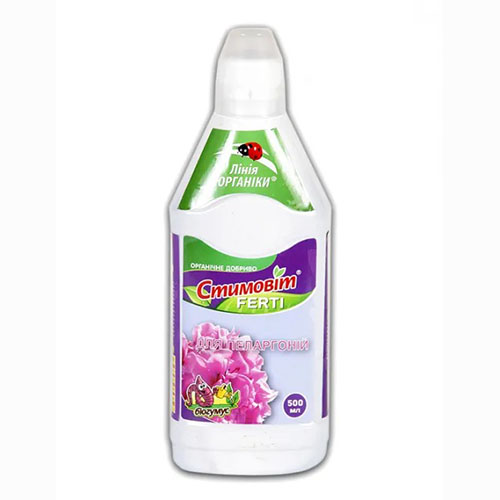 Стимовіт для пеларгоній – ефективний органічний комплекс з екстракту біогумусу. Він забезпечує рослини всіма необхідними корисними речовинами, вітамінами і ферментами. Культури краще розвиваються, більш пишно і тривало квітнуть, поліпшується їх опірність захворюванням, а забарвлення бутонів стає більш інтенсивним.