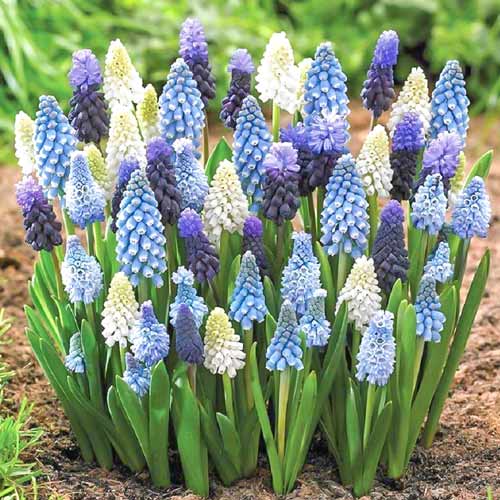 Комплект мускарі Арменікум – мікс сортів з великими суцвіттями, які можуть складатися з 50 і більше ароматних бутонів-дзвіночків. У наборі є традиційні сині й білі сорти, а також блакитні, лілові та інші відтінки цих кольорів. Квітконоси з'являються вже через кілька днів після танення снігу. Цвітіння триває кілька тижнів – до розкриття останнього бутону. Завдяки високому коефіцієнту розмноження кожна рослина швидко формує навколо себе ошатну галявинку невисоких первоцвітів.