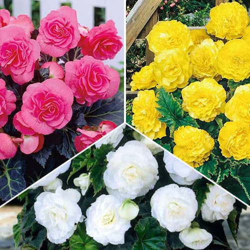 Наша суперпропозиція включає сорти махрових бегоній з білими, рожевими та жовтими квітами.