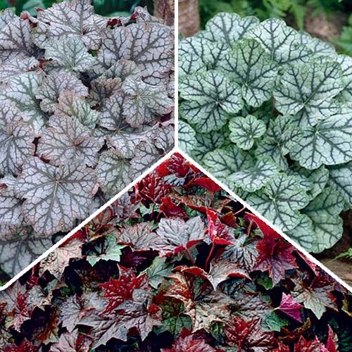 Ці рослини не втрачають своєї привабливості на протязі всього сезону. Ажурне листя благородних відтінків – пурпурного, смарагдового і перламутрового прикрасять квітники, клумби і рабатки. Гейхери чудово поєднуються з різними рослинами та квітами. Вони підкреслюють індивідуальність кожної культури і є прекрасним тлом для будь-яких композицій. В набір, який пропонує наш магазин, входять три кореневища різнокольорових сортів.
