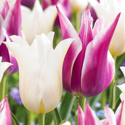 Комплект лілієвидних тюльпанів з 2 сортів – чудовий набір однакових за висотою та різних за забарвленням цибулинних багаторічників. Висота квітконосів не перевищує 30-40 см. Бокали витончені з дуже ефектними загостреними вгорі пелюстками. Розпускаються вони у квітні – травні, у цей час клумба буде насичена двома фарбами – фарфорово-білим та ліловим. Обидва сорти прекрасно підійдуть для відкритого ґрунту, їх замовляють для вигонки та зрізки.