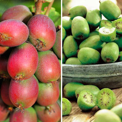 Актинідія або міні-ківі – це ліана, яка виростає до 3-5 метрів у висоту. Вона обплітає будь-яку опору, надаючи непоказним дачним будівлям гарний вигляд, а крім того, ще й плодоносить. Комплект включає в себе два сорти з ягодами різного кольору – смарагдово-зеленими і червоними.
