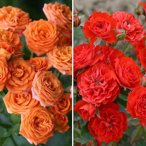 Комплект Дуо – це компактні красивоквітучи чагарники, які по мірі розростання формують ошатні широкі куртини. Троянди призначені для вирощування у вазонах, кашпо, у балконних контейнерах. Оранж Бейбі й Ред Мікадо – відмінне композиційне рішення, завдяки якому ви зможете прикрасити скульптурні вази, парадні сходи, зали, центральні алеї та газони.