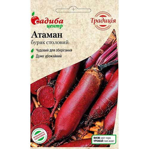 Буряк Атаман – врожайний сорт столового призначення з коренеплодами витягнутої циліндричної форми. Жилкування м'якоті виражено слабо, колір рівний, без світлих зон. Середня маса плодів – 280 грам, що дуже зручно для щоденного приготування улюблених страв в домашніх умовах.