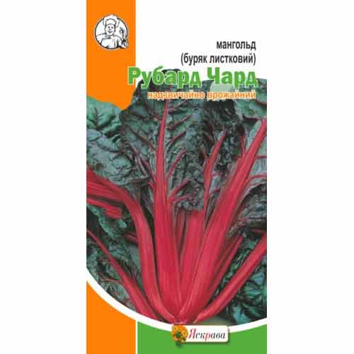 Буряк листовий (мангольд) Рубарб Чард-овочева салатно-шпинатна культура з вегетаційним терміном в 40 днів. Формує великі, м'ясисті, насиченого червоного відтінку листя з соковитими щільними черешками. Врожайність становить 30 кг/м2.