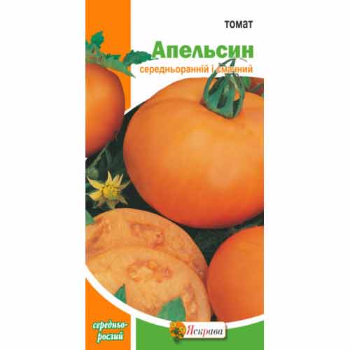 Томат Апельсин - сорт середньостиглий, круглий, м'ясистий, оранжевого кольору. Плоди розміром 180-230 г. Плоди дуже солодкі, відмінно підійдуть для консервації. На одному тільки гроні виростає до 5 томатів, кущ досить високий 120-140 см. Відмінна риса цього сорту в його високому вмісті каротину. Рекомендується до споживання в період хвороб, а також це улюблений сорт усіх дітей! Урожай стабільний.