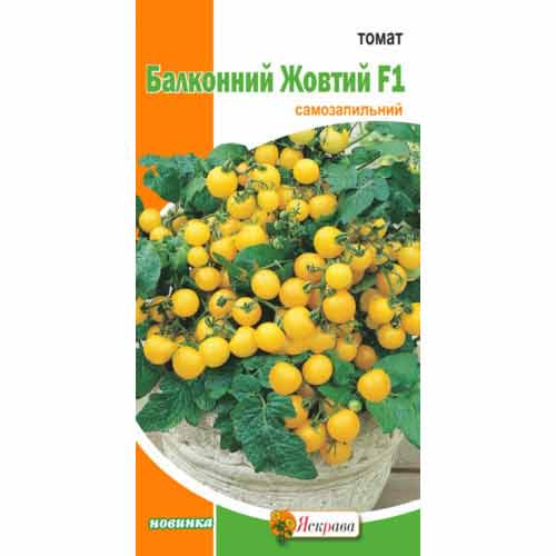 Томат Балконний жовтий F1 – надзвичайно швидкостиглий сорт із невисокими кущиками (до 40 см), призначений для вирощування в незахищеному ґрунті. Він чудово буде плодоносити висаджений у вазон або контейнер. Вазони з рослиною можна поставити на підвіконня, балкон. Яскраві, кольору сонечка плоди вагою до 30 г прикрашають томат із початку липня і до самих холодів. Смак у них приємно-солодкуватий, аромат насичений.
