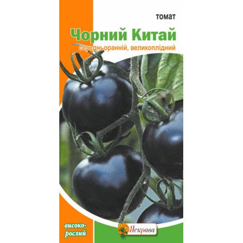 Томат Чорний Китай - новий середньоранній високоврожайний сорт, привертає до себе увагу унікальним забарвленням. До повного дозрівання стає практично чорним. Сорт індетермінантний, висотою до 1,7 м, потрібне встановлення опор. Середня вага плодів 250-300 г. Екзотичні томати найчастіше використовують для прикрашання страв, а також додають у салати і закуски. Незважаючи на ефектний зовнішній вигляд, смак у нього класичний, трохи солодкуватий з освіжаючою кислинкою.