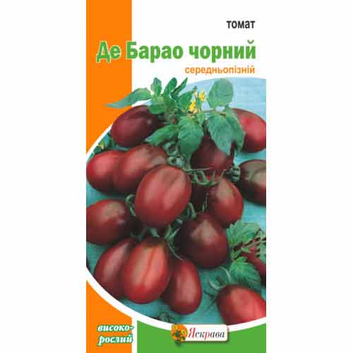 Томат Де-Барао чорний – сорт з оригінальним забарвленням, гарними смаковими характеристиками та високою врожайністю. Це велика рослина з високими кущами та компактними суцвіттями. Одна гілка дає в середньому від 5 до 10 плодів овально-яйцеподібної форми. Плоди великі, масою до 100 г, гладенькі, щільні, нерівномірного червоного кольору з чорними прожилками. Сорт універсального використання і довгого зберігання.