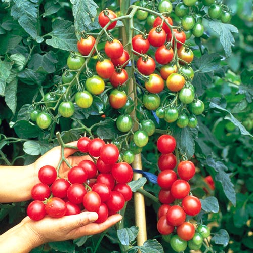 Ампельна рослина прекрасно приживається у невеликих горщиках і підвісних кошиках. Кущі швидко розростаються й утворюють справжні ліани до 60 см завдовжки. На них гронами тісняться червоні помідори, масою до 25 г. Їх так люблять маленькі дітки! А як незвично й оригінально виглядають такі малятка в консервованому вигляді! Період від висадки розсади до дозрівання – 47-50 днів.