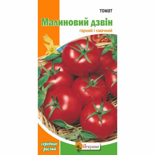 Томат Малиновий дзвін - середньостиглий детермінантний гібрид з періодом дозрівання 115-120 днів. Кущ штамбовий, а це означає, що корінь рослини розростається в сторони і не розвивається вглиб. Рослина міцна, компактна, висотою 100-120 см, тому з моменту формування плодів, потребує опори. Листя темно-зелене, без пухнастого покриву, трохи зморщене, не загущується, тому можливість заразитися від хворого сусіда низька. Сорт стійкий до низки основних захворювань.