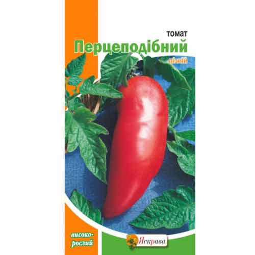 Томат Перцевидний - приголомшливий новий сорт з незвичайними плодами. Рослини індетермінантні, висотою 1,8-2 м, середнього терміну дозрівання. Термін дозрівання 111-115 днів. Червоні, м'ясисті, схожі на перчики, вони важать по 130-150 г кожен. Важкі китиці, в кожній з яких 5-7 томатів, бажано підв'язувати до опори. Ці томати гарні в салатах і соусах, але в усьому блиску проявляють себе при в'яленні. З них виходять найсмачніші, воістину делікатесні в'ялені томати. Урожайність у захищеному ґрунті 9-10 кг/м 2 .