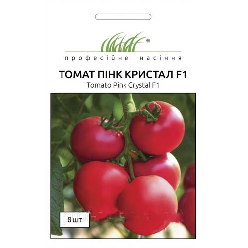"Томат Пінк Кристал – середньоранній рожевоплідний сорт, термін дозрівання 65-70 днів. Високопродуктивний тепличний томат, вага плоду 220-250 грам. Красива округло-плеската форма. Плоди спочатку не мають зеленої плями у плодоніжки. Плоди красиві, солодкі та смачні.