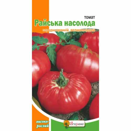 Томат Райська Насолода - рослина індетермінантна. Плід округлий, слаборебристий, червоний, великий, масою 350-400 г. Смакові якості свіжих плодів відмінні. Сорт стійкий до кладоспоріозу, ВТМ і бактеріальної плямистості. Урожайність 7-9 кг/кв.м. Рекомендується для вирощування у відкритому ґрунті та неопалюваних плівкових теплицях. Цінність сорту: висока продуктивність, великоплідність, стійкість до хвороб.