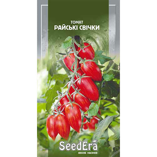 Томат Райські свічки - ранньостиглий, детермінантний сорт. Висота до 1 м. Форма плодів - незвичайна, кулевидна, з маленьким витягнутим носиком. Вага томатів 25 - 30 г. Сливки ніжно-рожевого кольору з золотистими смужками. Смак соковитий, трохи солодкий, помідорний. Сорт досить урожайний і невибагливий в догляді. Використовують в свіжому вигляді, салатах, консервуванні і соках.