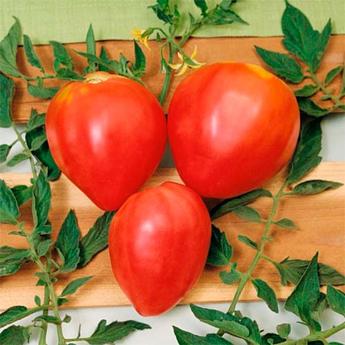 Томат Цукровий бізон – середньостиглий сорт з періодом дозрівання близько 100-120 діб. Відмінно росте на території всієї України. Плоди великі, трохи витягнуті, серцеподібної форми. Їх маса досягає 600 і навіть 800 г. Висота кущів – 80-100 см. Плоди солодкі з ледь помітною кислинкою, найкраще їх вживати у свіжому вигляді. Замовляйте насіння томатів Цукровий бізон – у них відмінна якість, а схожість досягає рекордних 98%!