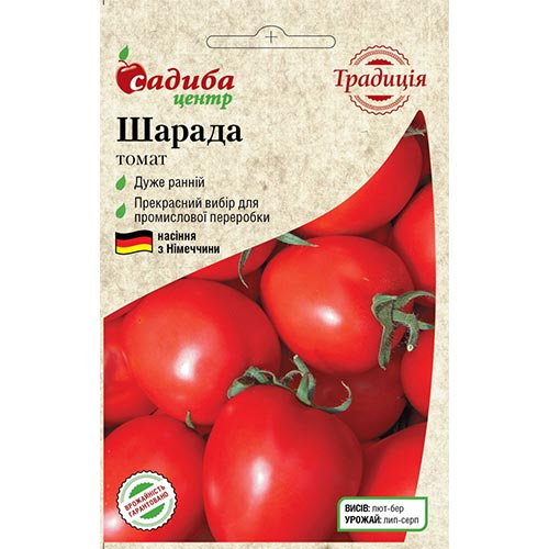 Томат Шарада – засолювальний сорт, що належить до найкращих зразків німецької селекції. Надранній (95-110 днів) сорт, що добре переносить кліматичні умови північних регіонів. Плоди сливовидно-яйцевидної форми, вагою 80-95 г, гладкі, червоного кольору, дуже щільні.