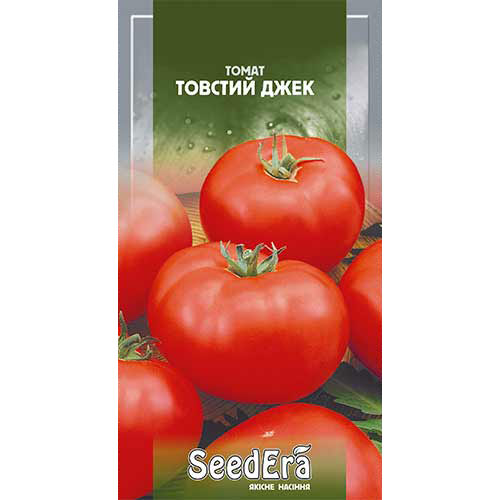 Томат Товстий Джек - середньостиглий, високоврожайний, детермінантний сорт. Для відкритого ґрунту. Термін дозрівання 95 - 105 днів. Кущ потужний до 0,6 м. Потребує підв'язки до опори і пасинкування. Плоди мають круглу форму, червоного кольору, вагою 200 - 300 г. Смак солодкий, ароматний, помідорний. Використовують в свіжому вигляді, салатах, консервуванні і соках.