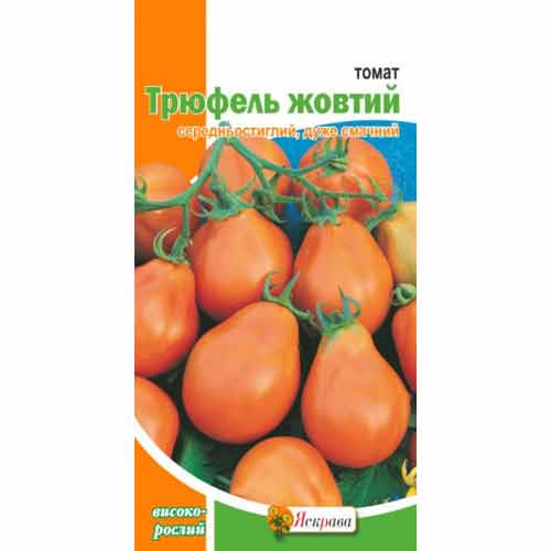 Томат Трюфель жовтий - середньостиглий індетермінантний гібрид. Як усі сорти жовтих помідорів він солодший за своїх червоних і рожевих побратимів. Щільна шкірка дає змогу не втрачати товарний вигляд під час транспортування, підходять для консервації. Сорт делікатесний, смак тонкий і ніжний. Доглядати за рослиною нескладно, достатньо дотримуватися режиму поливу і вчасно формувати кущ. Плодів зав'язується багато по 5-6 штук, дозрівають усі. Маса томата 140 г. За формою вони схожі на лампочку. Рослина у відкритому ґрунті досягає 150 см. Урожайність хороша 3-4 кг з куща.