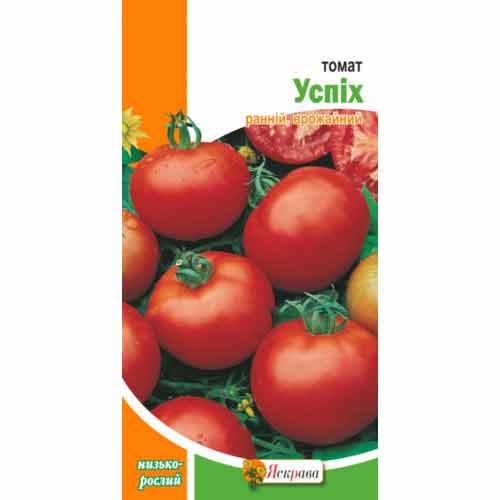 Томат Успіх - дуже ранній сорт для відкритого ґрунту і плівкових укриттів. Термін дозрівання 83-95 днів .Рослина детермінантна, штамбова. Не потребує пасинкування. Плоди червоні, сливовидні з "носиком", дуже щільні з високим вмістом сухих речовин, масою 60-70 г. Цінність сорту: холодостійкість, стійкість до стресів, особливо перепадів температур, стабільно висока врожайність, придатність для тривалого транспортування. Рекомендується для вживання у свіжому вигляді та цільноплідного консервування, особливо у власному соку.