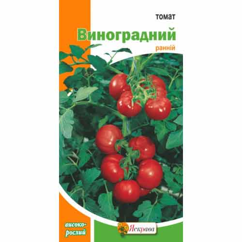 Томат Виноградний - висока культура раннього терміну дозрівання (100 днів) з мініатюрними плодами категорії "черрі". На сильному облиственном стеблі формуються кисті по 5-6 круглих томатів вагою до 30 Г. плоди відрізняються хорошою транспортабельністю, смаковими якостями, універсальністю вживання.