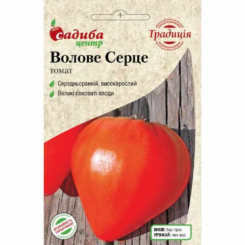 Томат Волове серце - середньостиглий індетермінантний сорт для вирощування у відкритому ґрунті та теплицях. Термін дозрівання 115-120 днів. Плоди серцеподібні, рожево-малинові, великі, середньою масою 160-210 г, а деякі екземпляри до 400 г, відмінного смаку, переважно салатного використання.