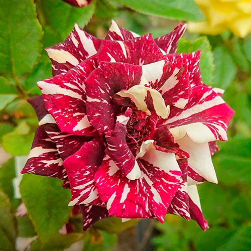 Троянда Анрі Матіс (Henri Matisse) - чудовий, чайно-гібридний сорт, відомий своїми яскравими квітами і стійкістю. Квітки мають великий розмір до 12 см в діаметрі, махрову структуру і насичене забарвлення. Вони малиново-червоні з білими і рожевими штрихами, що надає їм особливого шарму. Мають густомахрову форму і приємний аромат. Кущ досягає висоти 80-120 см з прямими, міцними пагонами і красивим, блискучим зеленим листям. Використовується в різних стилях ландшафтного дизайну, включаючи романтичні та класичні сади. Добре комбінується з іншими рослинами.