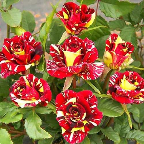 Фокус Покус (Focus Pocus) - ця флорібунда завдяки строкатому забарвленню в цяточку виглядає дуже інтригуюче й ефектно. Кущ виростає компактний, гіллястий, висотою до 55 см і шириною до 50 см. Принадність сорту в темно-червоних бутонах, келихоподібної форми, оксамитові пелюстки яких хаотично і непередбачувано оздоблені жовтими мазками нерівномірної ширини і форми. Але можливий і такий фокус, що бутон повністю забарвлений у жовтий колір. Діаметр квіток середнього розміру, до 5-7 см. На одному стеблі виростає до 5 троянд у суцвітті. Найкраще сорт виглядає в одиночних посадках, але можна його стильно поєднувати з однотонними сортами. Флористи так само високо оцінили троянду Фокус Покус за можливість створювати цікаві та помітні квіткові композиції.
