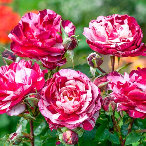 Кремово-бузкові з фіолетово-малиновими, бордовими, червоними смужками і плямами квітки, чашоподібної форми, середньо-махрові (17 - 25 пелюсток), у повному розпуску показують серединку, зібрані в суцвіття на прямостоячих пагонах, що відливають пурпуром, мають насичений аромат. Кущ компактний, з глянцевим, темно-зеленим листям.