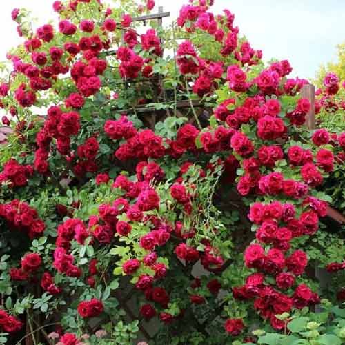 Троянда Клаймінг Кримсон Глорі - дуже красивий оксамитовий глибокий насичено-багряний колір, з темними тінями у старих квіток. Квітки дуже великі, вишнево-червоні, середньо-махрові, до 30 пелюсток, класичної форми в напіврозпуску і відкритої чашовидної - в повному, з сильним ароматом, на пагонах як поодинокі, так і в невеликих суцвіттях. При цьому сорт характеризується високою стійкістю до захворювань.