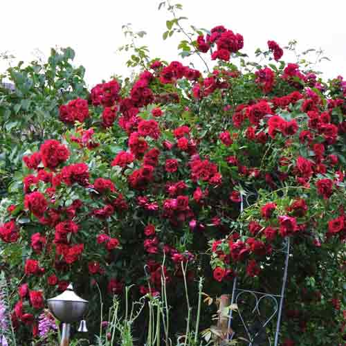 Троянда плетиста Сілуетта Кримсон - як і всі троянди із серії Siluetta дуже яскрава і компактна. Квітки невеликі, діаметром до 4 см, махрові, кармінно-червоного відтінку. За рахунок того, що бутони зібрані в суцвіття-парасольки, в період цвітіння весь кущ немов усипаний квітами. Може рости як на сонці, так і в півтіні. Висота куща до 180 см, при цьому ширина всього 60-70 см. Аромат у сорту ніжний, солодкуватий.