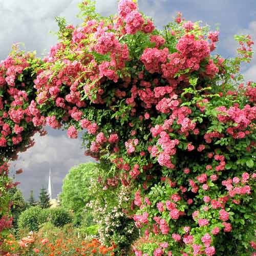 Троянда плетиста Силуетта Романтик - рясно квітуча з великими суцвіттями-парасольками на гнучких пагонах. Кущик, заввишки 200 см, по ширині компактний, тому вона ідеально прикрасить невеликий простір. Квітки в діаметрі невеликі, 4-5 см, густо-махрові, ніжно-рожевого кольору. Аромат у сорту приємний і помірний. Чудово підходить для декорування альтанок, парканів, сходів.