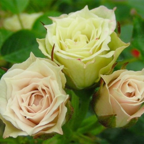 Троянда спрей Грін Даймонд - цей сорт цінують за дивовижне і рідкісне забарвлення. Бутони у сорту рожеві, але в повному розпуску стають світло-зеленими, кольору шартрез. За формою кущ дуже компактний, до 50 см заввишки. Форма бутонів незвичайна, вони мають овальну форму, а їхні краї загострені. Коли бутони розпускаються, квітки набувають чашоподібної форми. Рясне цвітіння триває до заморозків.