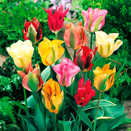 Тюльпани зеленоквіткові, суміш забарвлень – це готова яскрава клумба в одній упаковці! Жовті, червоні, рожеві, білі пелюстки можуть бути абсолютно різними, що їх об'єднує так це контрастна зелена смужка на «спинках». Вона вигідно підкреслює колір і змушує довго милуватися цікавими бутонами. Думаєте, які квіти підібрати для яскравої і цікавої клумби? Ми зробили це за вас! Просто замовте цибулини зеленоквіткових тюльпанів різних забарвлень.